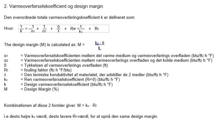 Pladevekslere har typisk k-værdier på ca. 1050–1300 btu/ft²h°F (vand/vand), mens rørvekslere ofte ligger på 350–440 btu/ft²h°F. Derfor kræver pladevekslere mindre margin for samme sikkerhed. - Margin tilføjes forskelligt