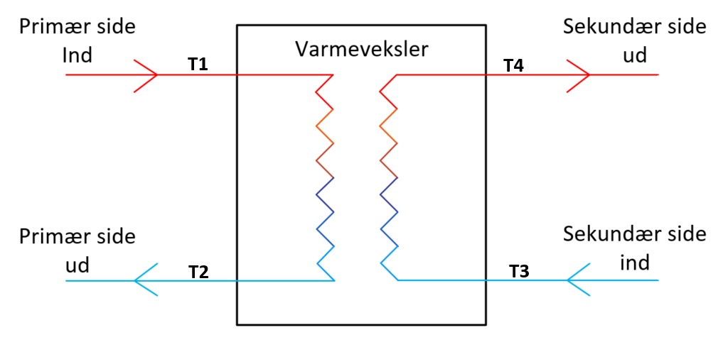 - indløbs- og udløbstemperaturer på primær og sekundær side